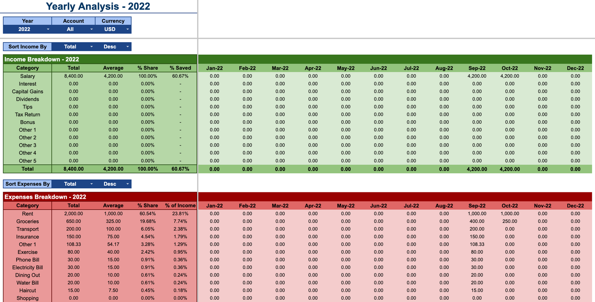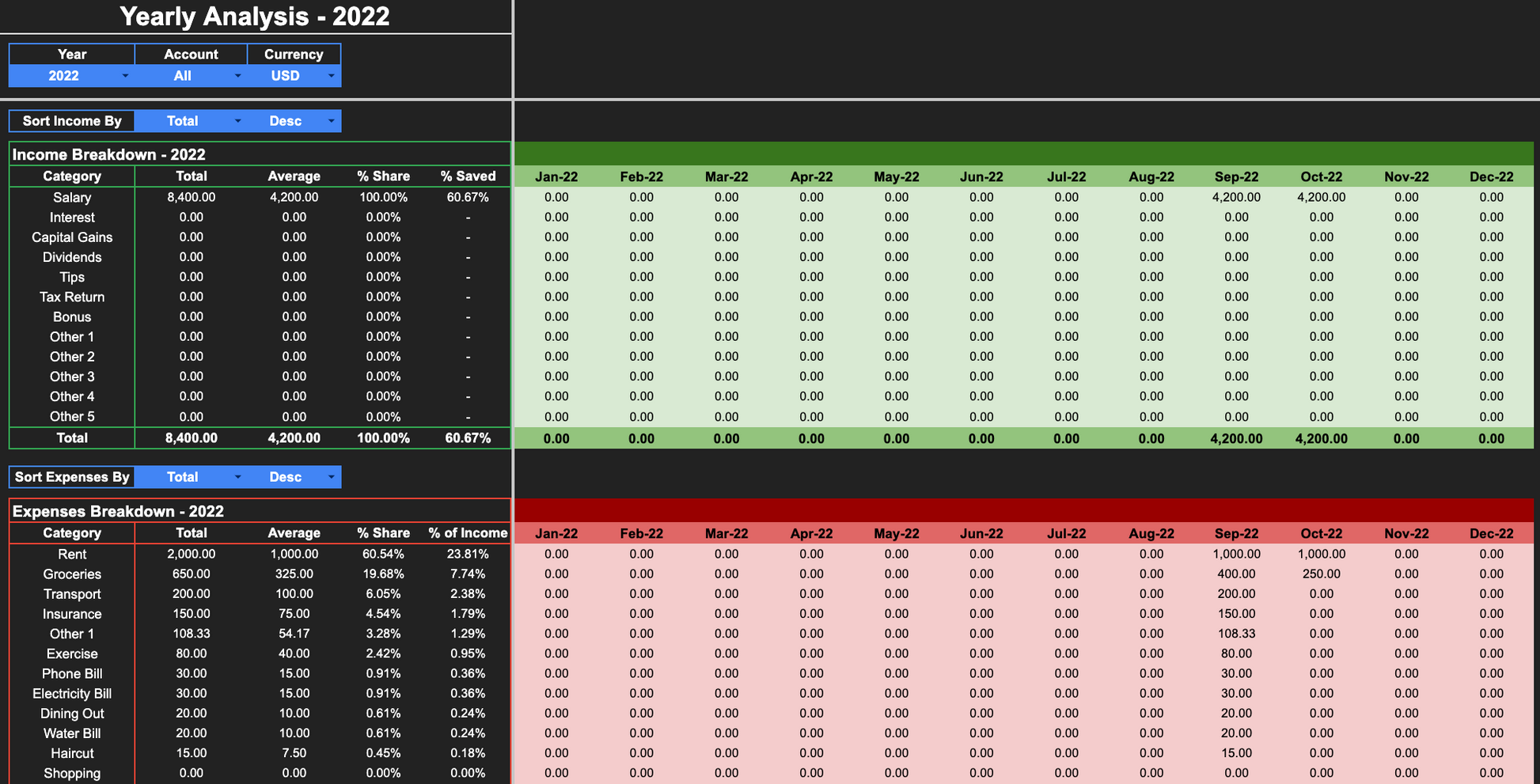 This is the Budget Tracker 3G. It combines features from Google Forms and Google Sheets to create a seamless collaboration between the process of entering transactions and analysing budget insights. This tracker is perfect to analyse and understand your monthly and annual spending/earning behaviours through versatile tables and charts. It includes capabilities to read data through different accounts (savings accounts, credit cards, etc.) as well as currency conversions for all transactions. It’s the ultimate tool to take control of your personal finances and sort through data in a user-friendly environment.